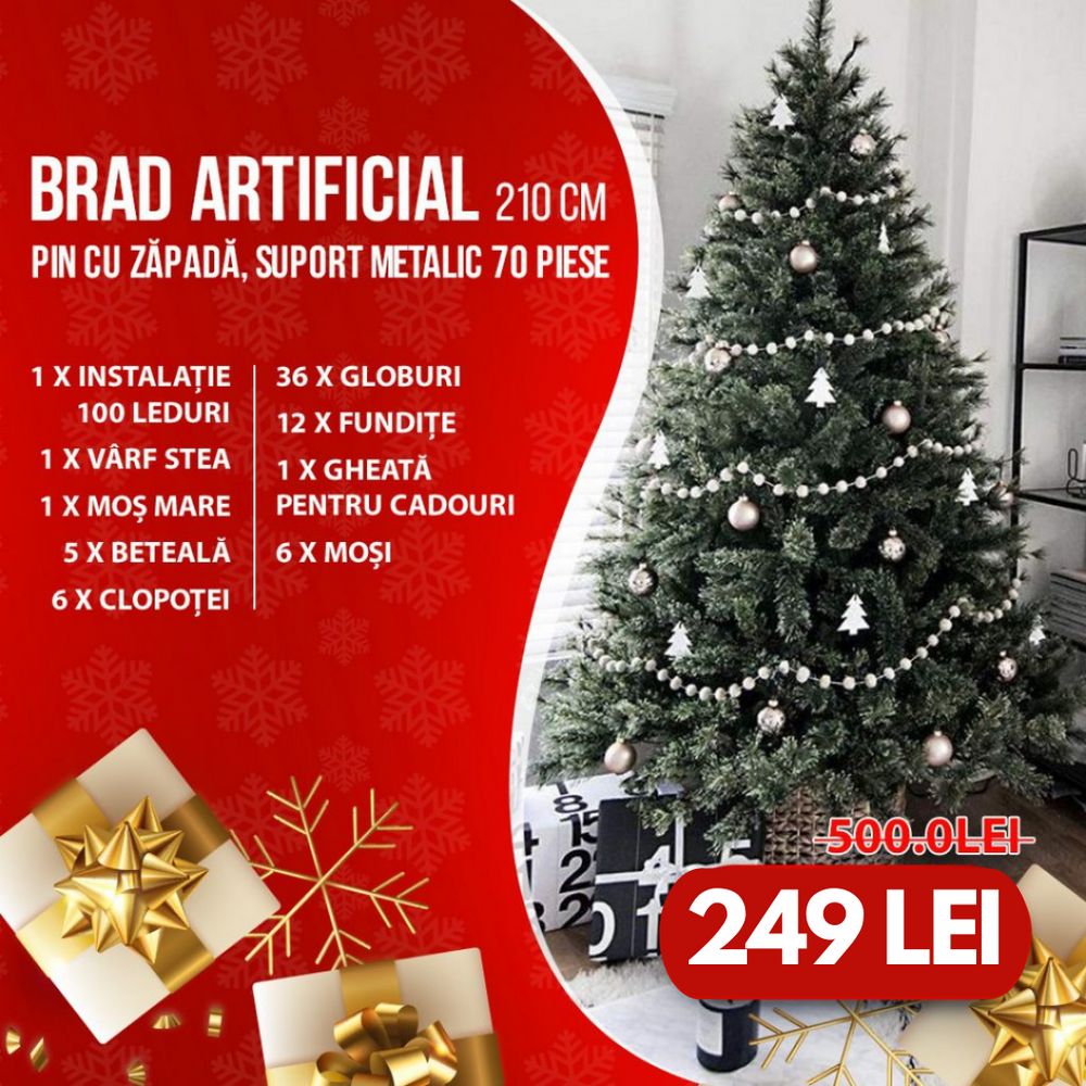 Brad artificial verde cu zapada , 2.1 m inaltime cu suport metalic