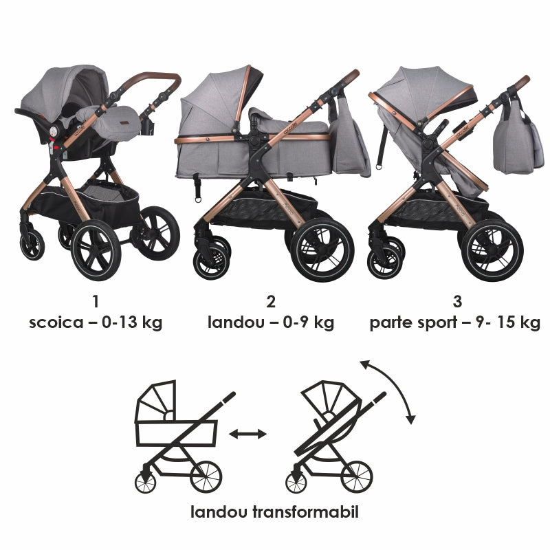 Caruciorul multifunctional este un set 3in1 complet, potrivit de la stadiul de nou-nascut si pana la aproximativ 3 ani.