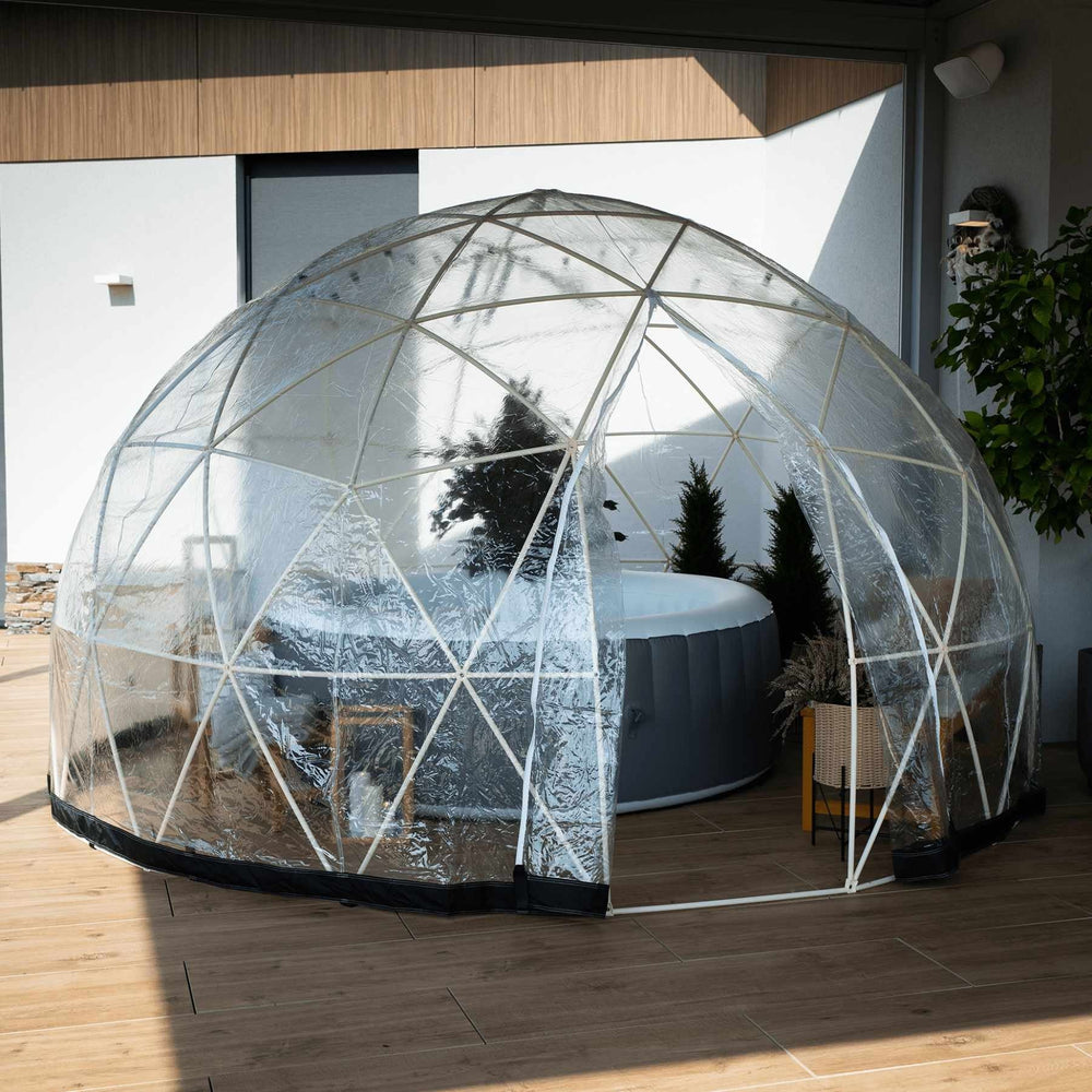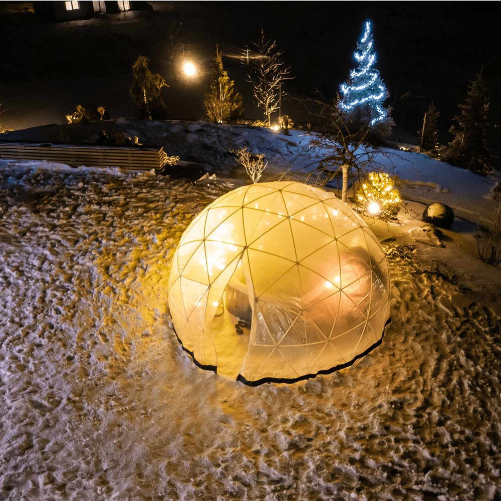 Igloo-ul este realizat din material PVC si ABS 100% reciclabil, puternic si durabil. Forma cupolei permite ca lumina soarelui sa fie transmisa in toate unghiurile, iar caldura este uniform distribuita in interior, in raport cu vremea.