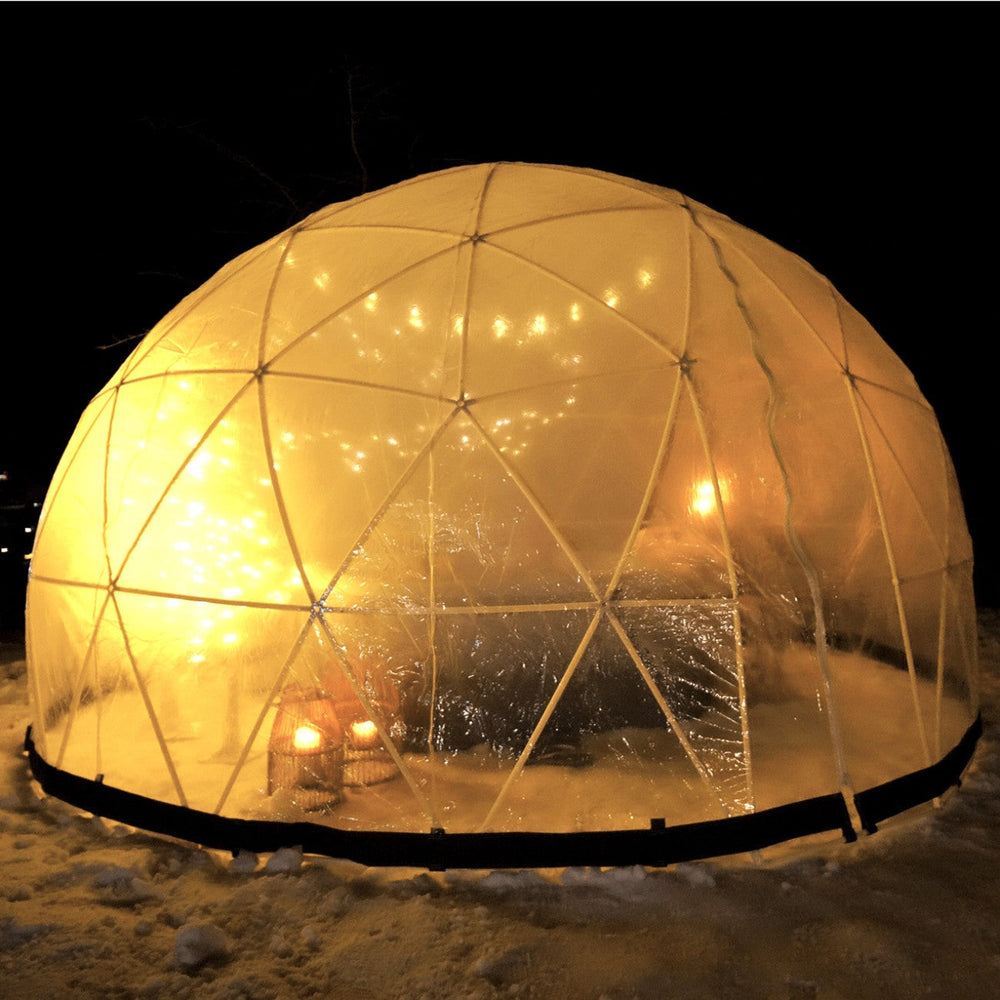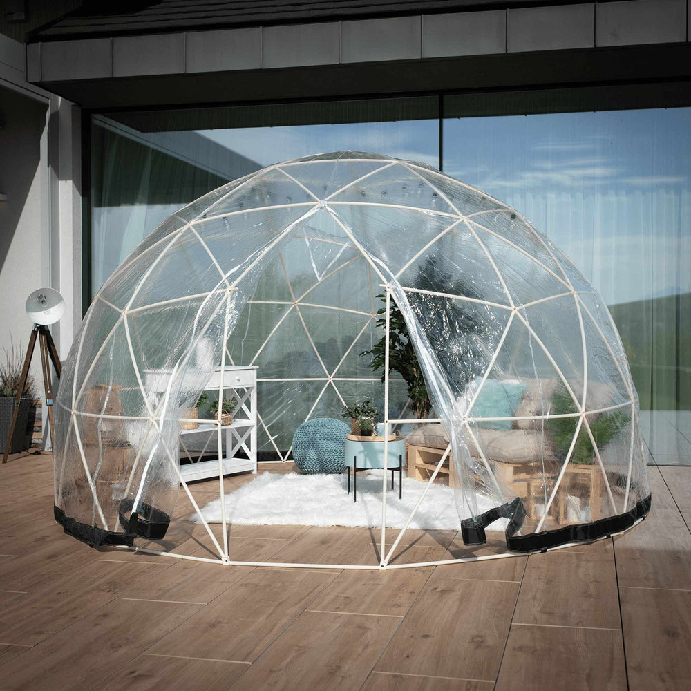 Igloo-ul este realizat din material PVC si ABS 100% reciclabil, puternic si durabil. Forma cupolei permite ca lumina soarelui sa fie transmisa in toate unghiurile, iar caldura este uniform distribuita in interior, in raport cu vremea.