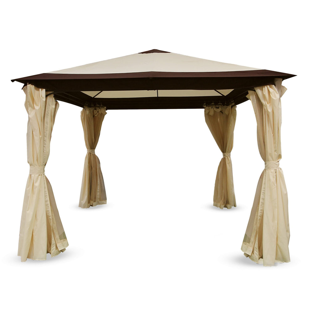 Este prevazut cu plasa impotriva insectelor si perdea pe toate laturile. Astfel, se poate acoperi de jur-imprejur, protejand de soare, vant sau precipitatii reduse. Culorile regasite sunt crem si maro inchis (pe marginile acoperisului), pavilionul avand un aspect foarte elegant, incadrandu-se cu usurinta in orice gradina sau curte.