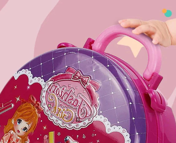 Trusa de machiaj pentru copii mici. Toate seturile de joc din valiza sunt realizate din materiale plastice non-toxice ecologice, cu margini rotunjite pentru a evita ranirea si pentru a asigura jocul in siguranta. Toate accesoriile pot fi depozitate in siguranta in valiza, usor de luat aproape oriunde.