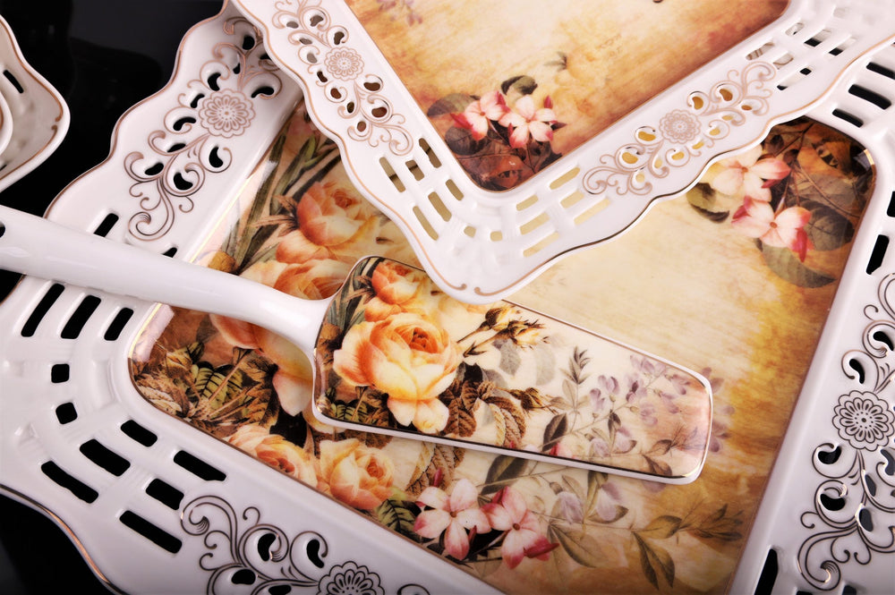 Setul de tort este un set format dintr-un platou+ 6 farfurioare+ 1 spatula.Facut din portelan fin , translucid, de cea mai buna calitate. Fiecare set vine cu un model in relief si imprimeuri unicate, ambalat si prezentat in cutii de cadou.