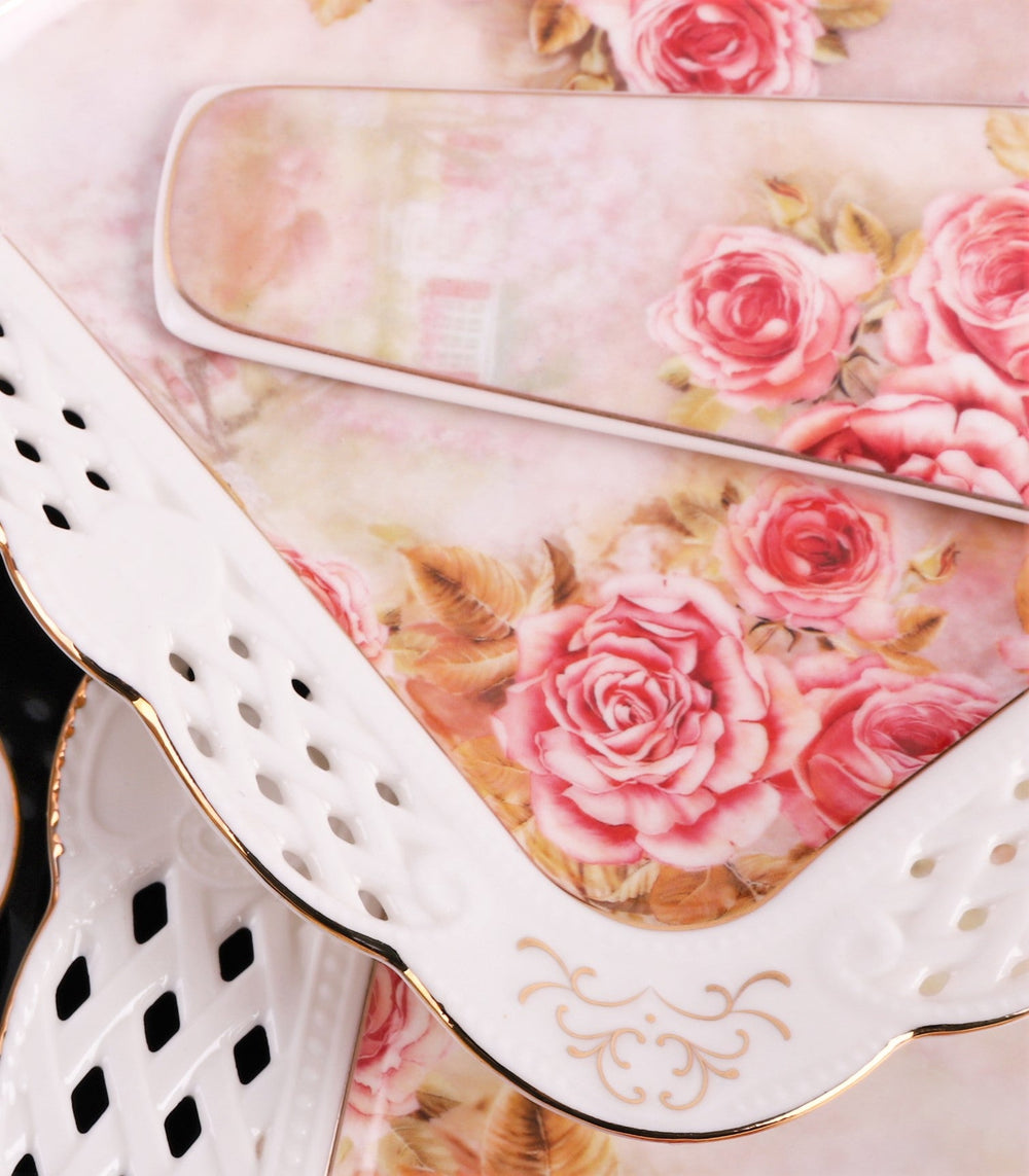 Setul de tort este un set format dintr-un platou+ 6 farfurioare+ 1 spatula.Facut din portelan fin, de cea mai buna calitate. Fiecare set vine cu un model atent ales si imprimeuri unicate, ambalat si prezentat in cutii de cadou.