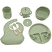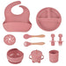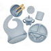 Setul pentru bebelusi sunt fabricate 100% din silicon alimentar moale, flexibil si durabil, care este bland cu gingiile, farfuria si bolul avand o baza care se fixeaza cu ventuze si sunt usor de curatat.
