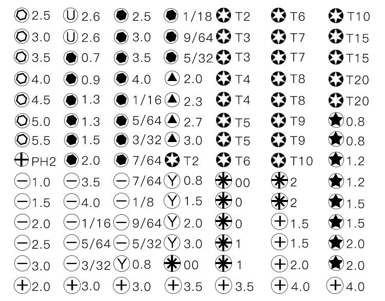 98 x biti (cruce, drept, hexagonal, patrat, sferic, torx, pentalobe, triunghi, stea, Y)